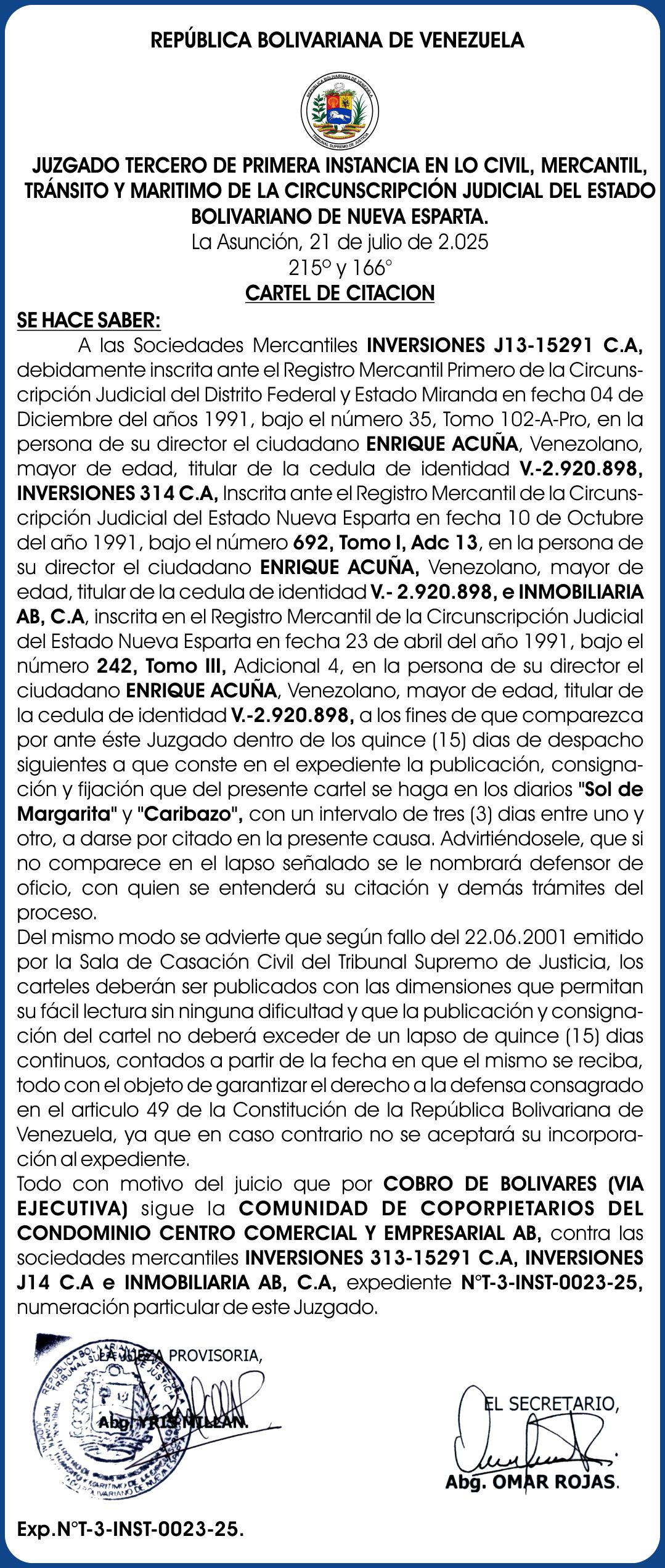 Reciente CARTEL-INVERSIONES-J13-15291-C.A-Exp.0023-28-07-25