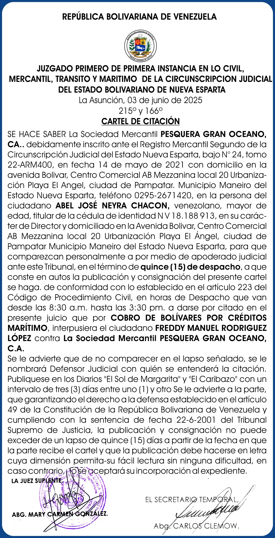 Reciente CONVOCATORIA Condominio Torre Ionio. 24-06-25