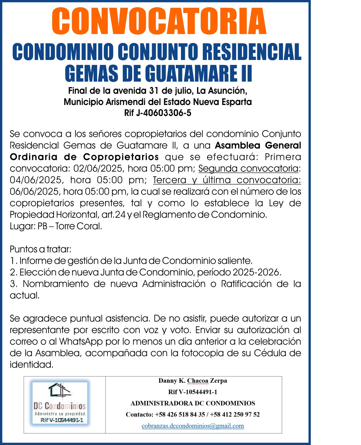 CONVOCATORIA CONDOMINIO CONJUNTO RESIDENCIAL GEMAS DE GUATAMARE II 21-05-25