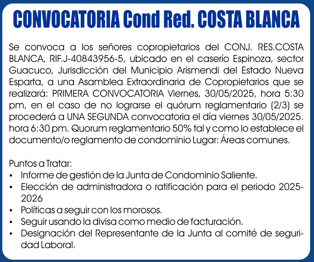 Antiguo CONVOCATORIA CONJUNTO RESIDENCIAL VENEZIA SUITES 19-05-25
