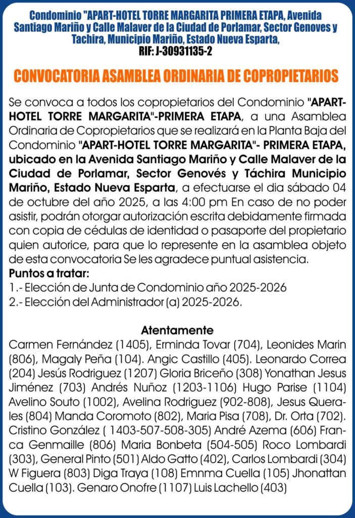CONVOCATORIA APARTHOTEL TORRE MARGARITA PRIMERA ETAPA 29-09-25.